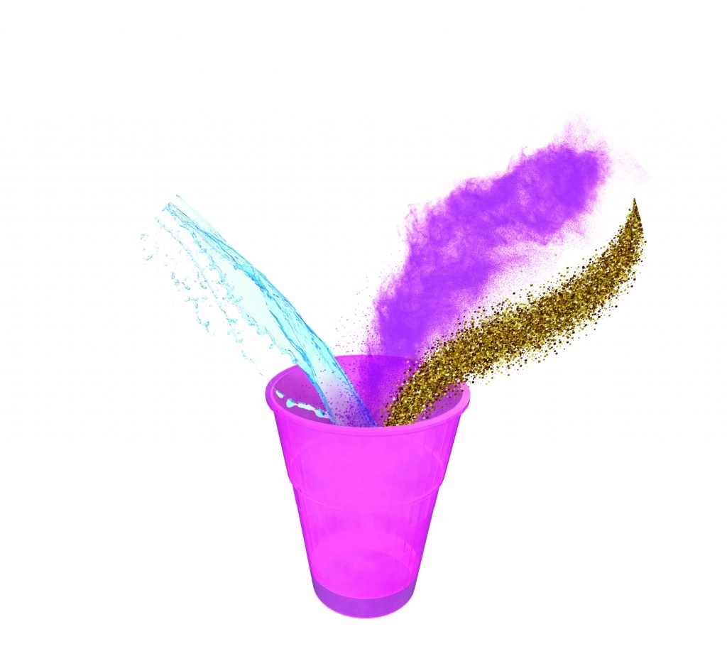 - Adăugați apă în pahar, turnați pudra și decorațiunile, închideți, agitați, lăsați 2 minute