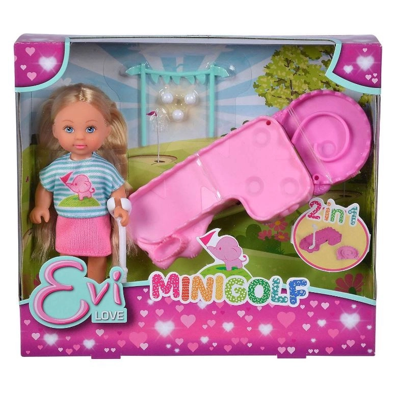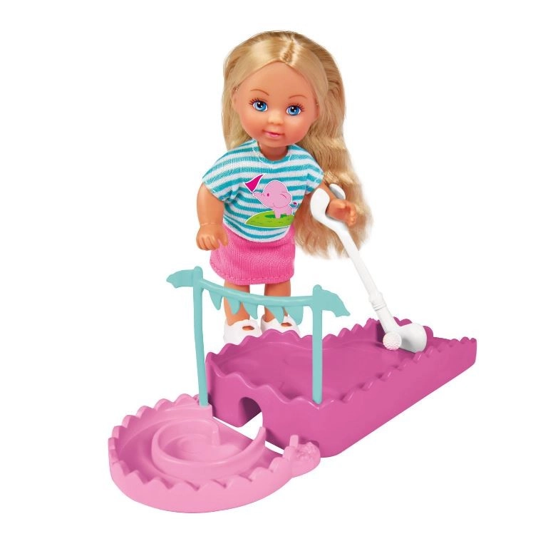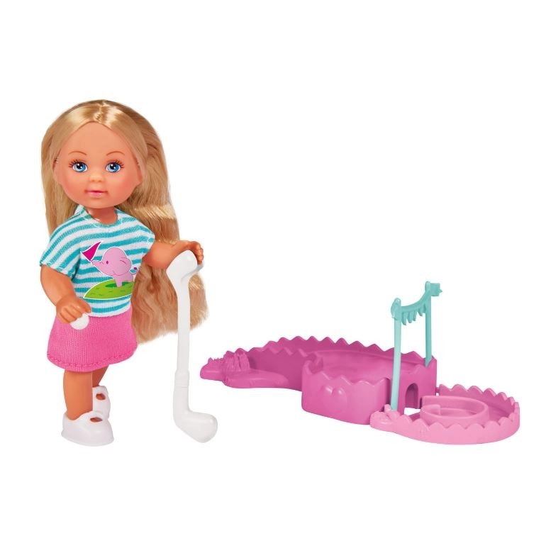 Descoperă lumea distractivă a sportului alături de păpușa Evi și setul ei de minigolf. Drăgălașa păpușă blondă cu articulații mobile poartă o ținută sport stilată și vine cu crosă de golf, mingiuță și mini teren, pentru ca cei mici să se bucure de joc de rol și joacă activă. Jocul susține imaginația, creativitatea și abilitățile sociale în joaca de zi cu zi.