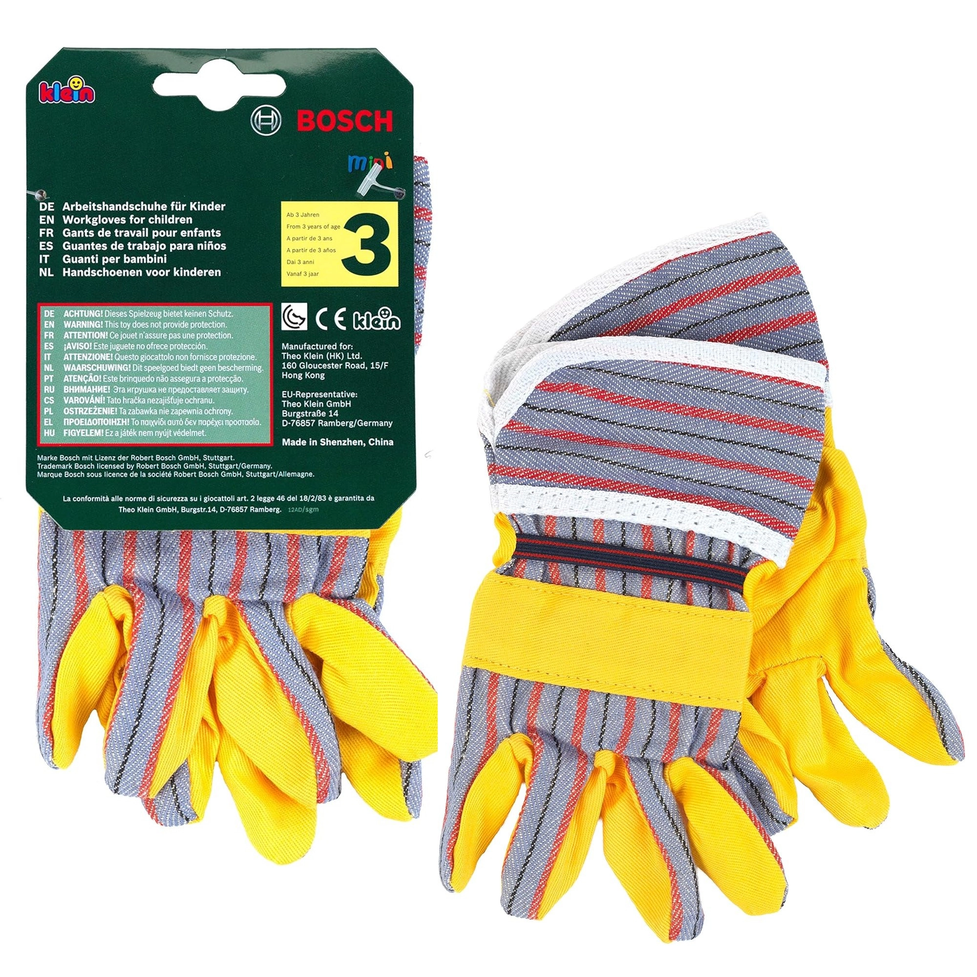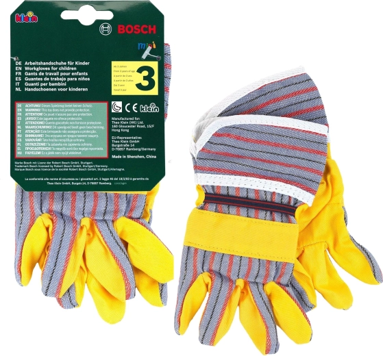 Mănușile de lucru pentru copii BOSCH de la brandul Klein sunt un accesoriu grozav pentru micii meșteri. Reproduc fidel mănușile reale, au palme galbene cu elemente gri în dungi, manșete elastice pentru o fixare mai bună și sunt ideale pentru joaca de-a meșteșugarii și grădinarii.