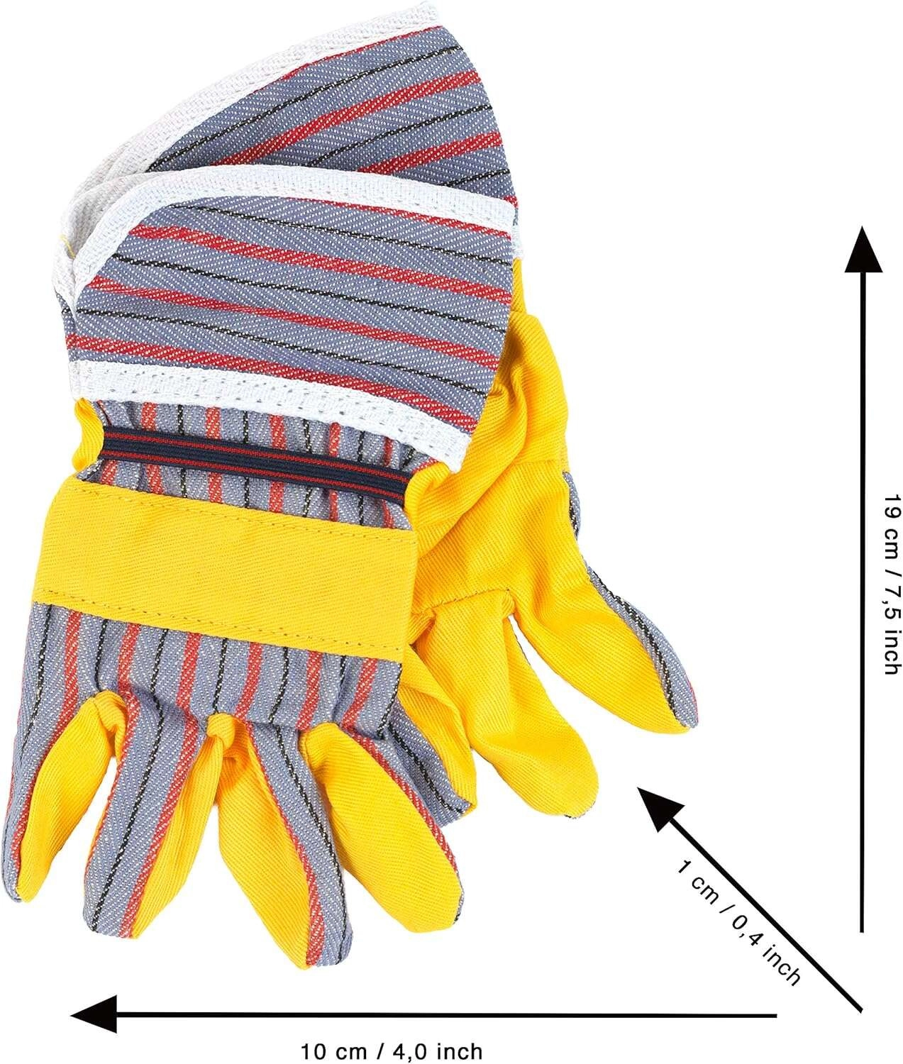 Copie fidelă a mănușilor de lucru, cu palme galbene și dos gri în dungi, pentru o joacă autentică de-a meșterii.