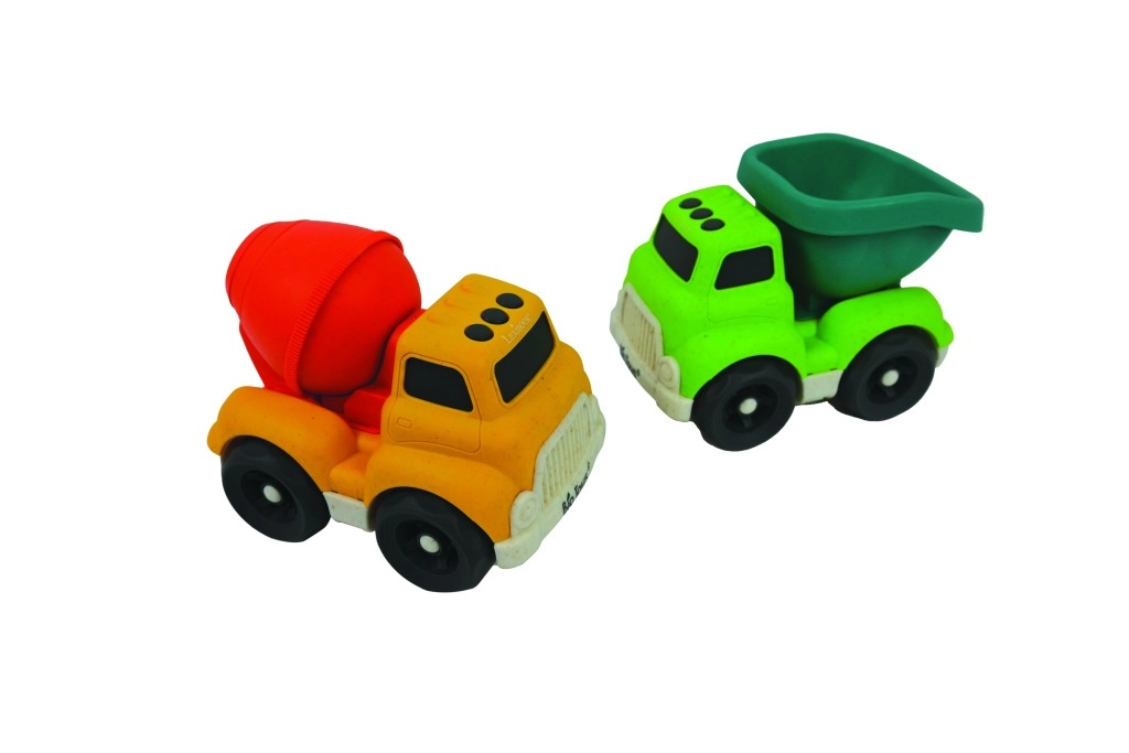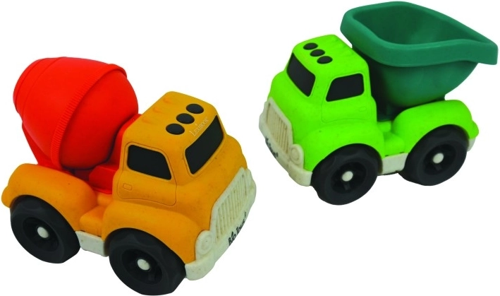 Setul conține un camion galben cu malaxor de beton roșu și un basculant verde cu benă turcoaz. Suprafața jucăriilor este mată și plăcută la atingere, roțile mari asigură rulare lină, iar marginile rotunjite permit o prindere sigură chiar și pentru mâinile mici. Datorită formei compacte, camioanele se controlează ușor și rezistă utilizării frecvente.