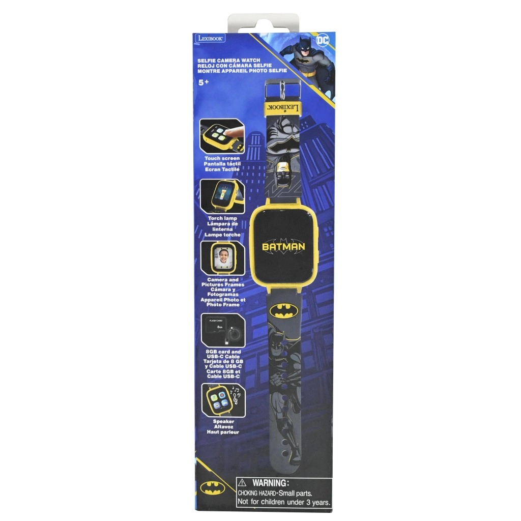 Pachetul include card SD de 8GB pentru stocarea imaginilor și cablu USB‑C pentru încărcare rapidă și transfer de date. Difuzorul integrat și lanterna extind posibilitățile de utilizare atât acasă, cât și în aer liber. Cureaua flexibilă cu grafică BATMAN, rama galbenă și sistemul comod de închidere asigură purtare confortabilă pe tot parcursul zilei.