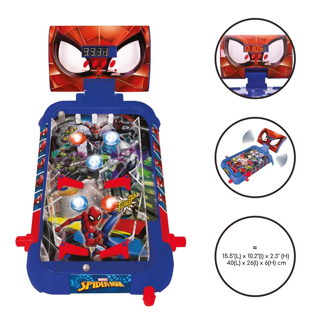 Bucurați-vă de un pinball plin de acțiune cu eroul SPIDER-MAN într-un format practic de masă. Corpul albastru cu elemente de control roșii, grafica atrăgătoare și afișajul digital clar, în stilul ochilor lui Spidey, garantează distracție pentru copii și întreaga familie. Capacul transparent protejează suprafața de joc și, în același timp, permite urmărirea fiecărei lovituri și ricoșeuri ale mingii.