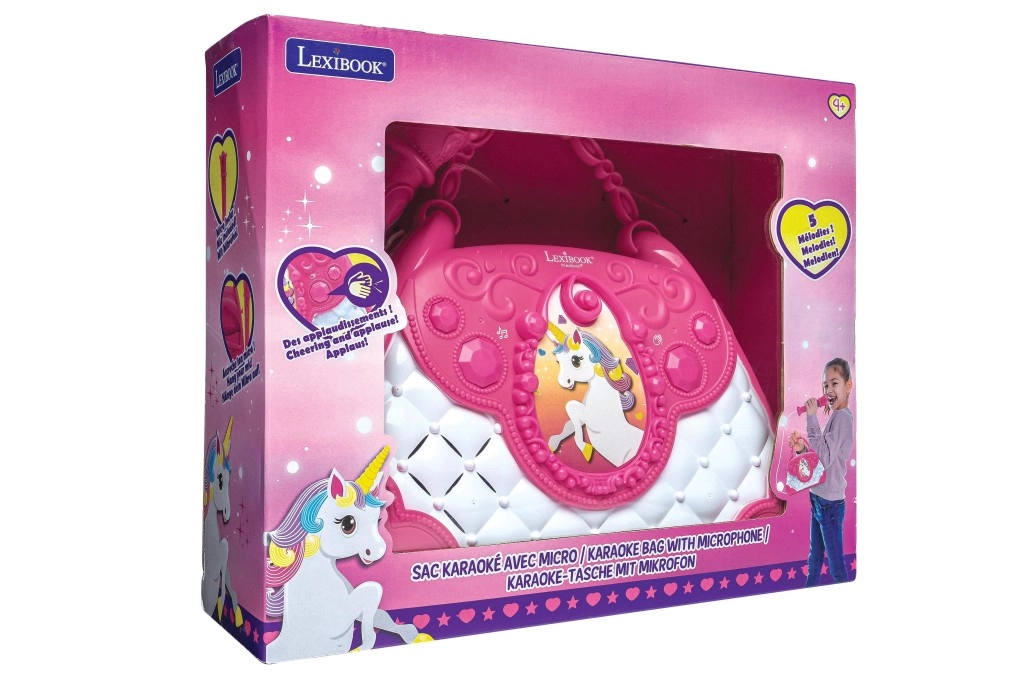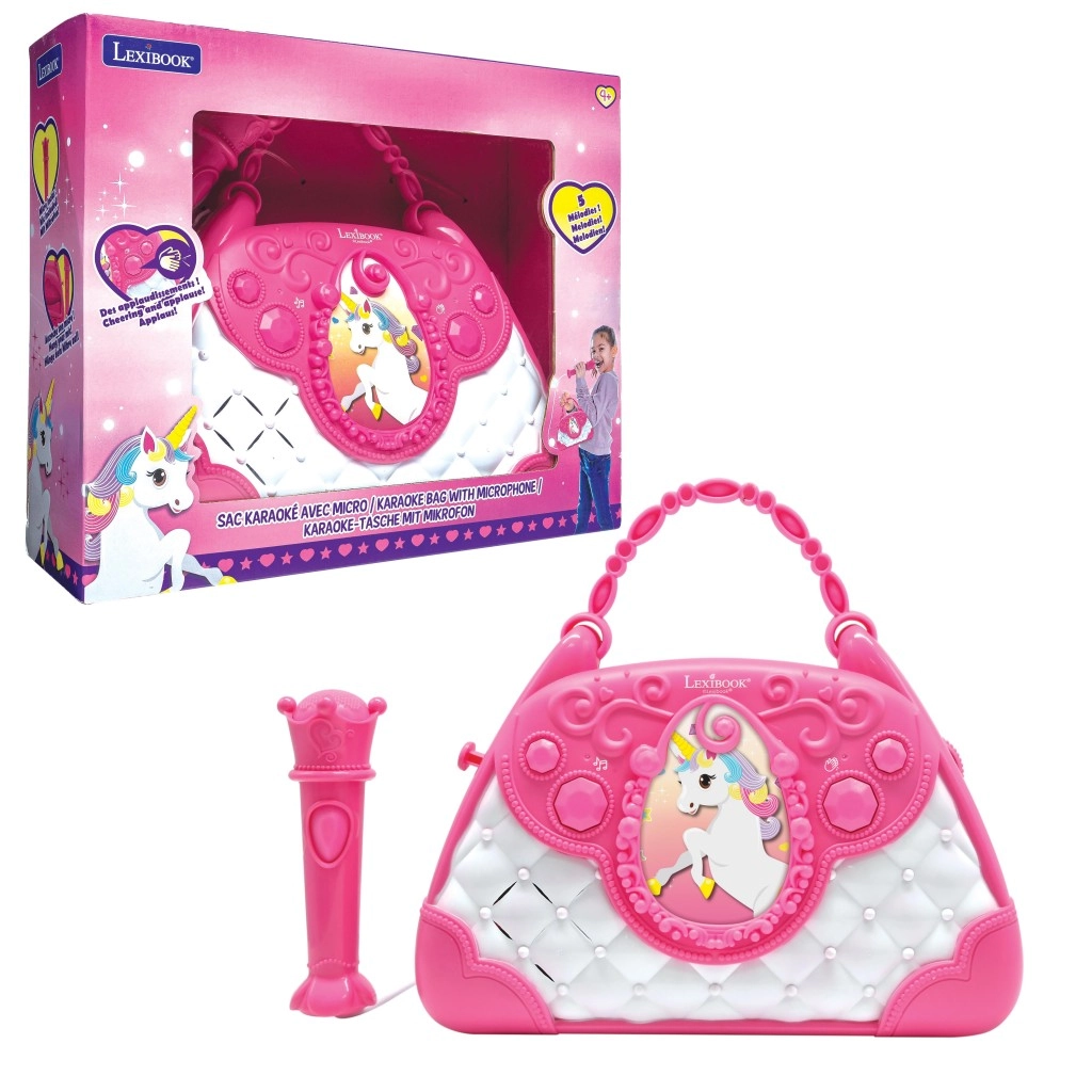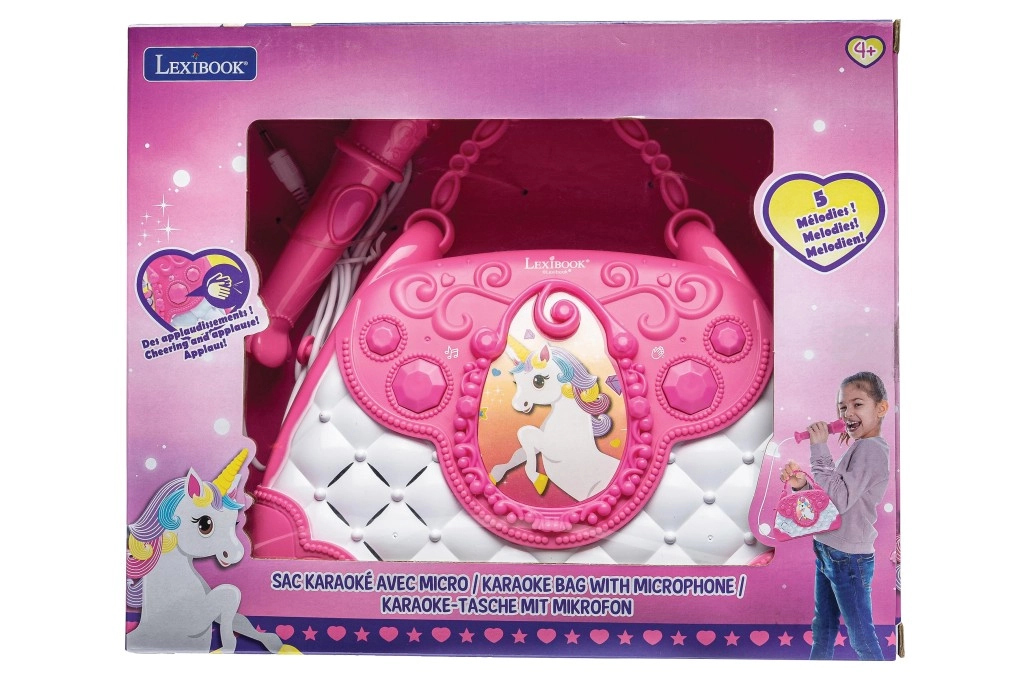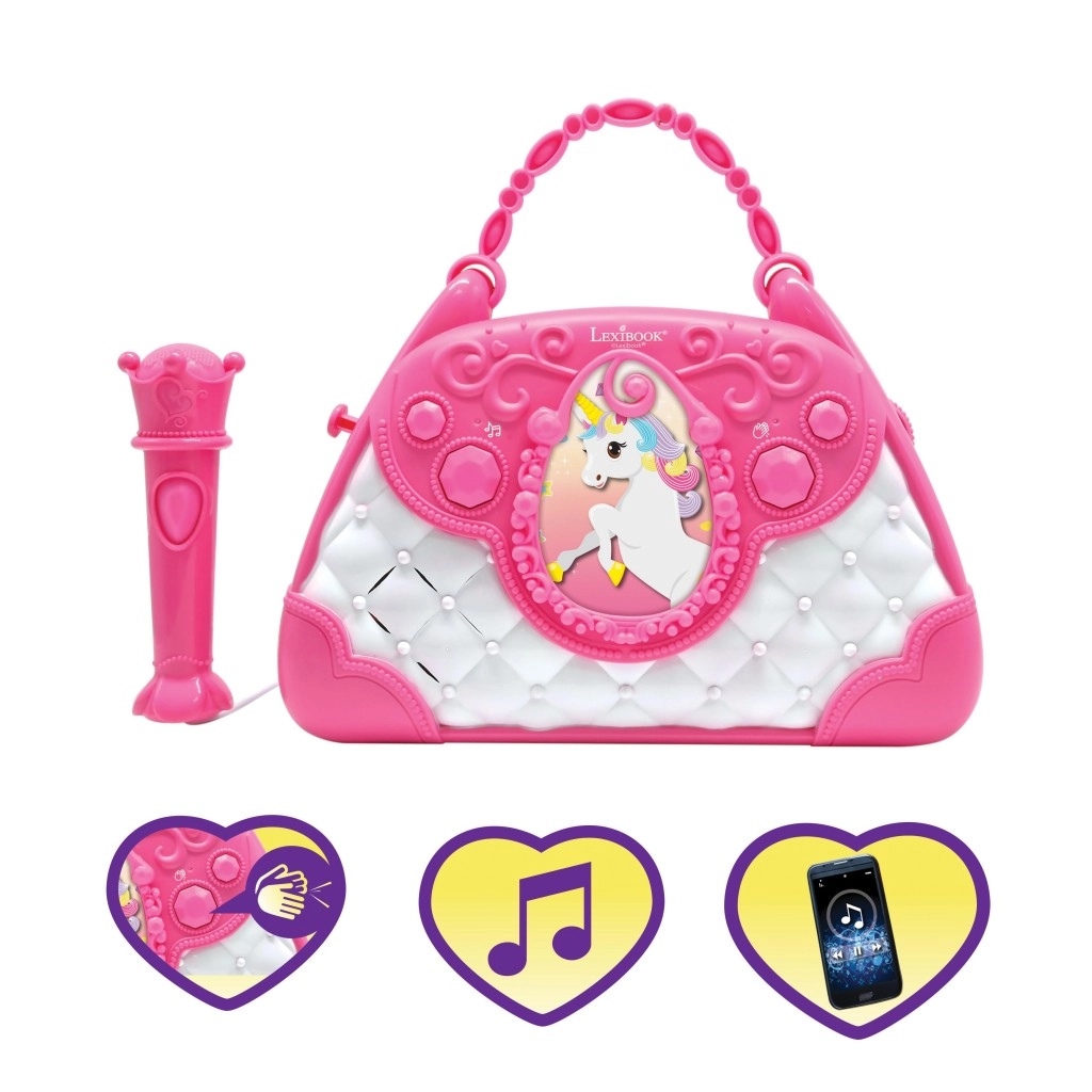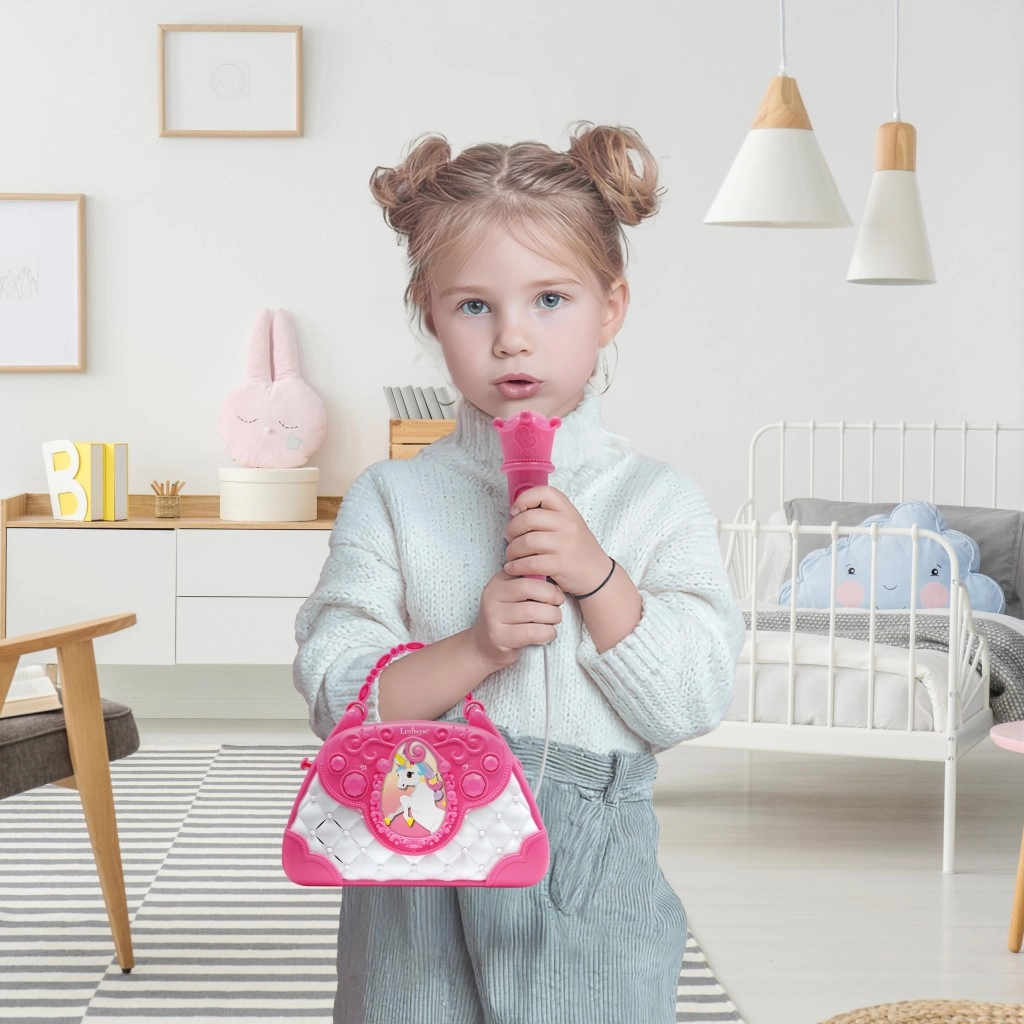 Geantă stilată roz-alb cu motiv de Unicorn care transformă fiecare zi într-o mică scenă. Copiii pot cânta la microfon și își pot asculta vocea prin difuzorul puternic încorporat. Datorită butoanelor intuitive, pot regla cu ușurință volumul, alege melodii și activa aplauzele, care le sporesc încrederea.