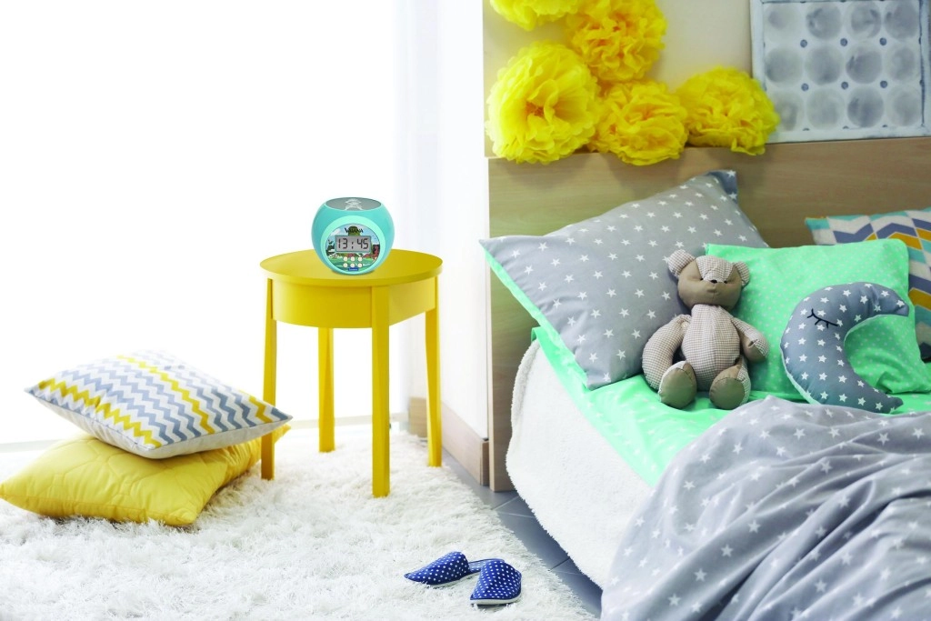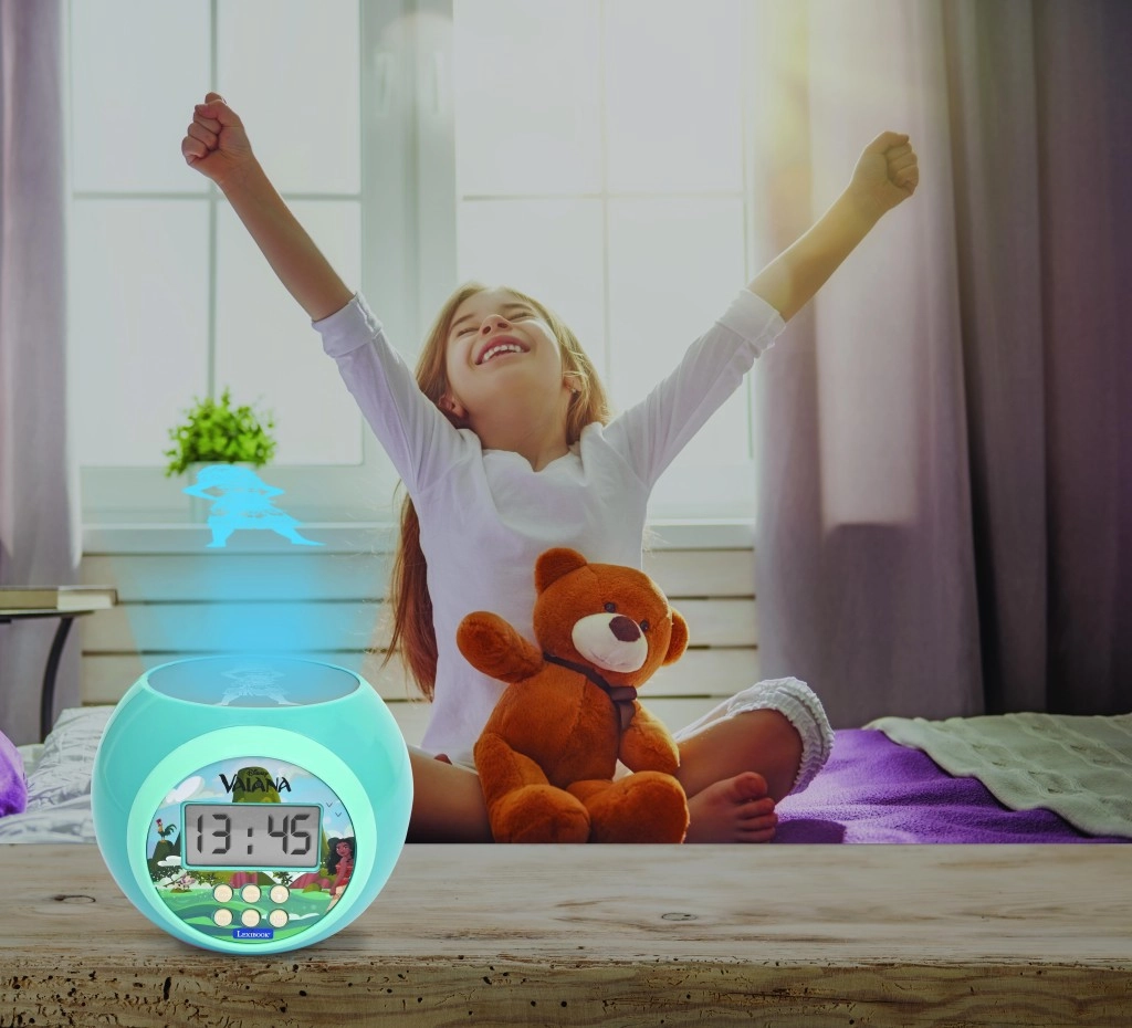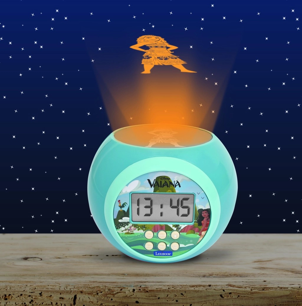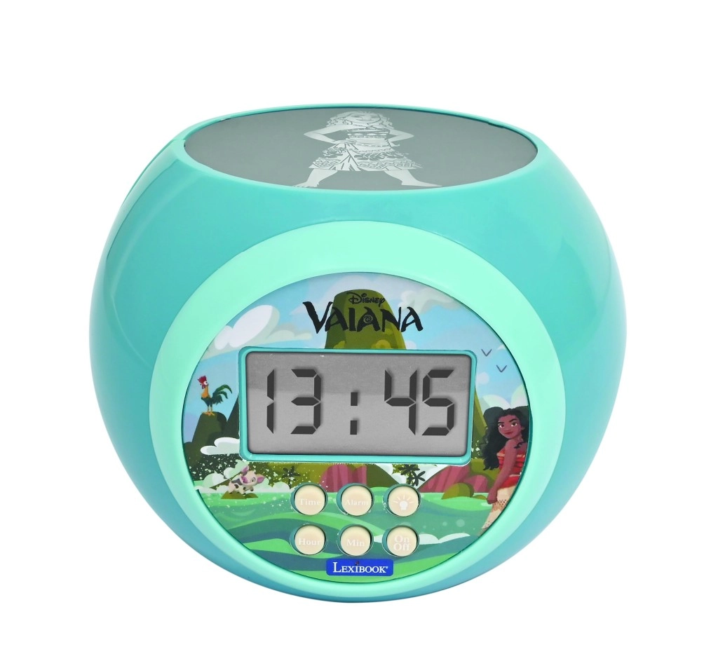 Cea mai mare magie o oferă proiectorul de tavan încorporat, care proiectează personajul Vaiana pe tavan sau pe perete. Datorită temporizatorului de 5/15/30 minute, setați durata proiecției exact după rutina de seară. Operarea este asigurată de cinci butoane intuitive sub ecran – pentru setarea orei, alarmei și luminii.