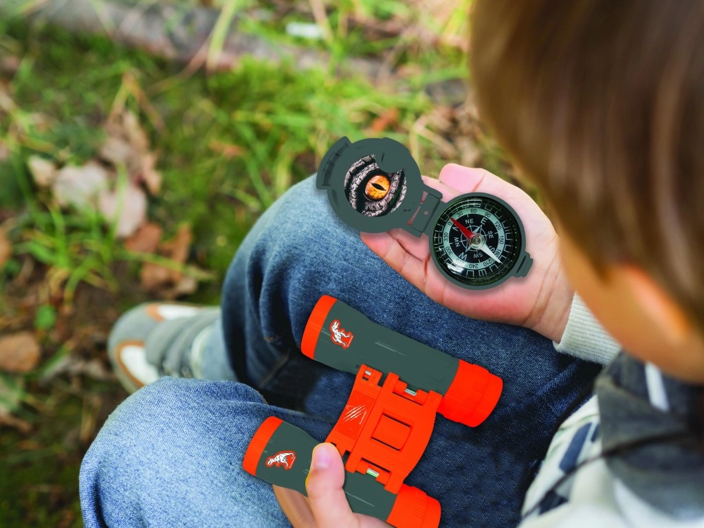 Set de aventură pentru micii exploratori de la 3 ani, care combină două stații walkie-talkie cu rază de acțiune de până la 120 m, binoclu pliabil, busolă și lanternă compactă într-o construcție rezistentă, cu motive cu dinozauri. Plastic robust, operare ușoară și design jucăuș închis la culoare cu accente portocalii deschise stimulează imaginația, îmbunătățesc comunicarea și orientarea în teren – atât acasă, cât și în aer liber.