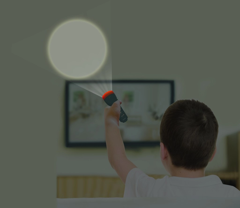 Lampă compactă, cu fascicul luminos intens și inel de control portocaliu, care îi ajută pe copii să exploreze în siguranță și la vizibilitate redusă.