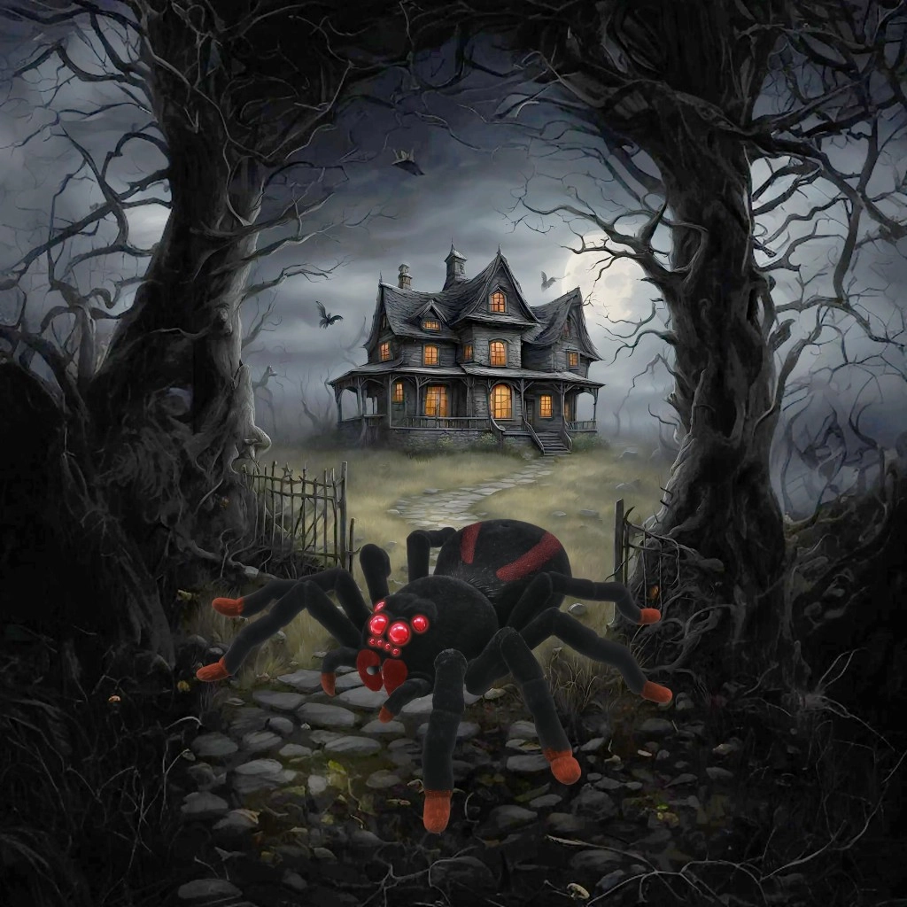 Tarantulă detaliată cu corp moale din pluș și mai mulți ochi LED care, odată aprinși, amplifică atmosfera înfricoșătoare în timpul jocului sau al farselor.