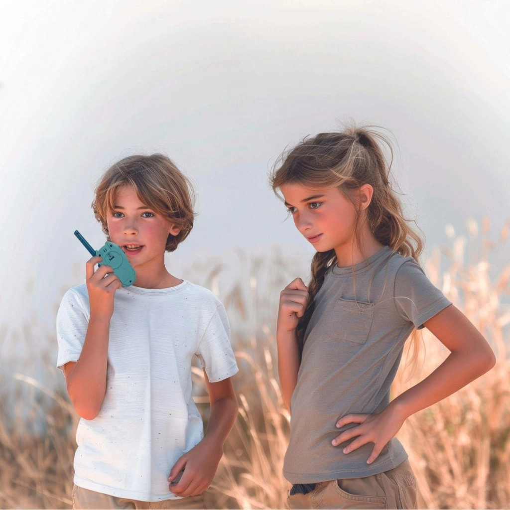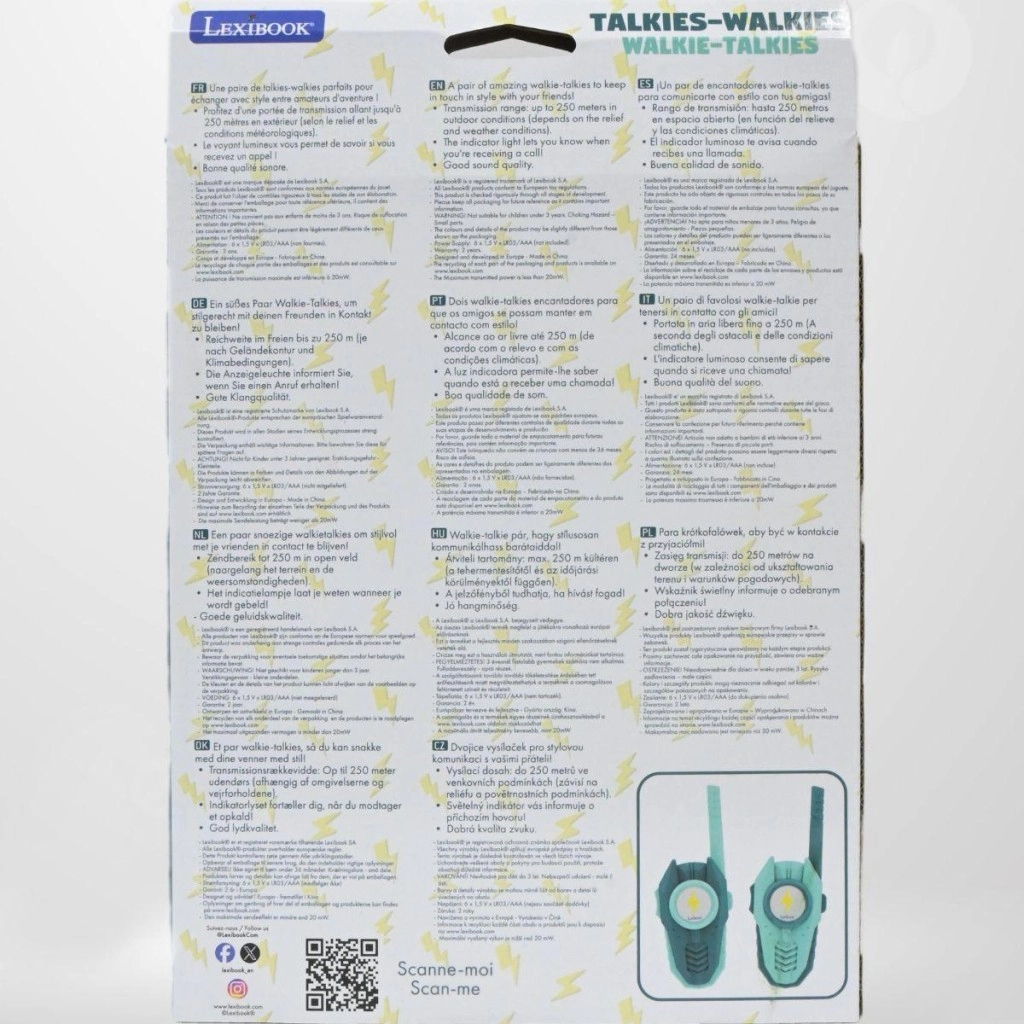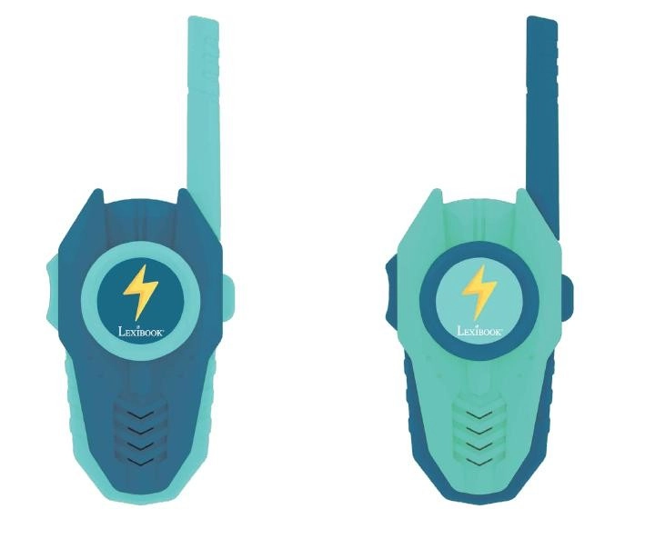 Setul include două walkie-talkie-uri în culoare modernă albastru–turcoaz, cu rotiță de control vizibilă și logo LEXIBOOK. Pentru funcționare sunt necesare 3× baterii AAA pentru fiecare stație (nu sunt incluse). Excelente pentru jocuri în aer liber, misiuni de echipă și dezvoltarea abilităților de comunicare.