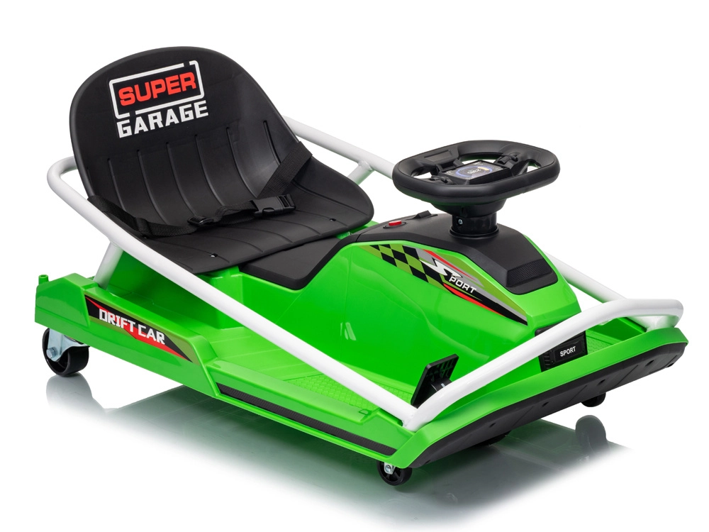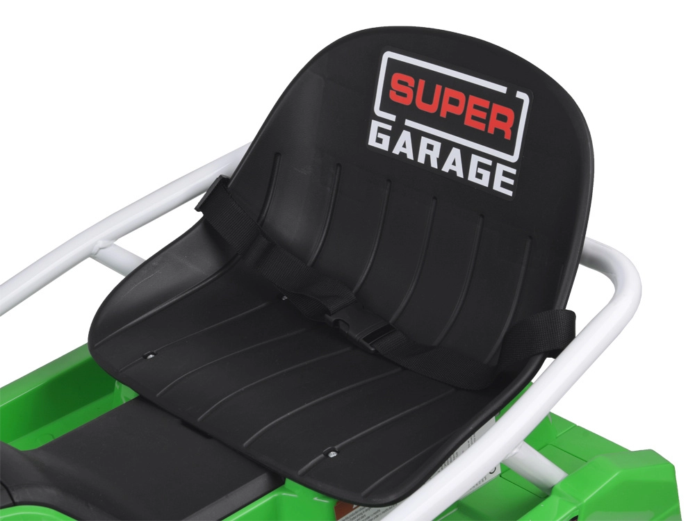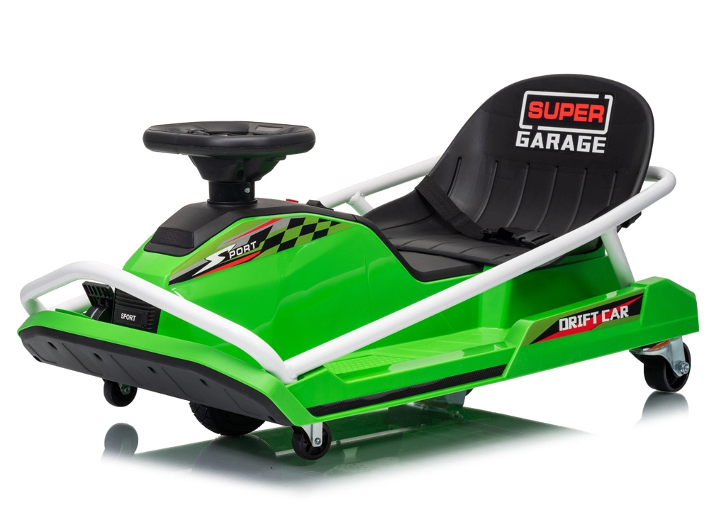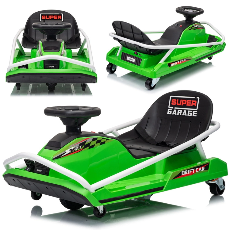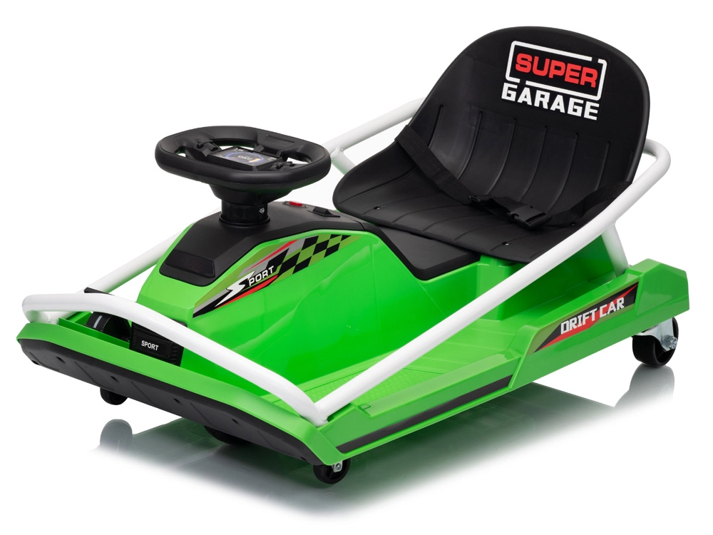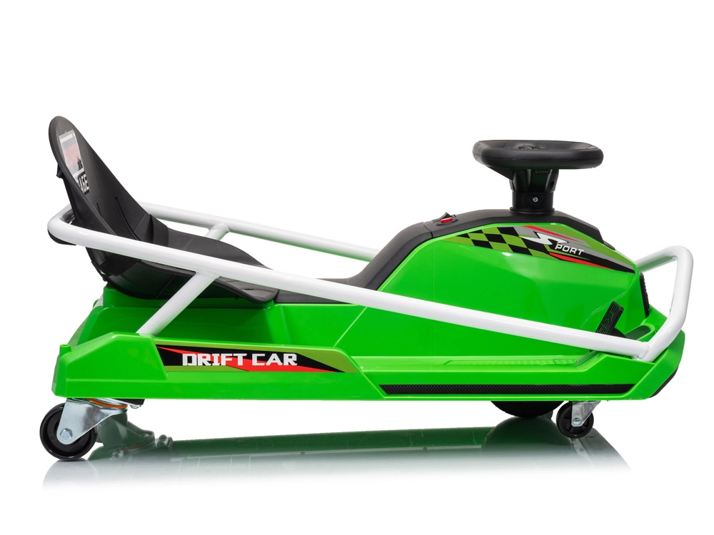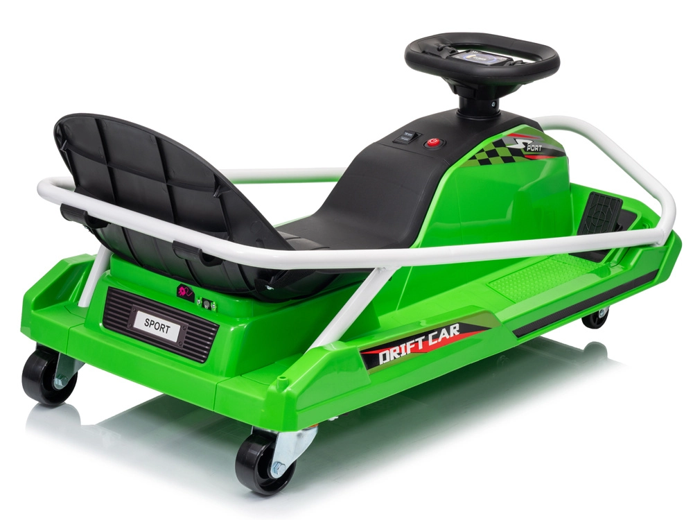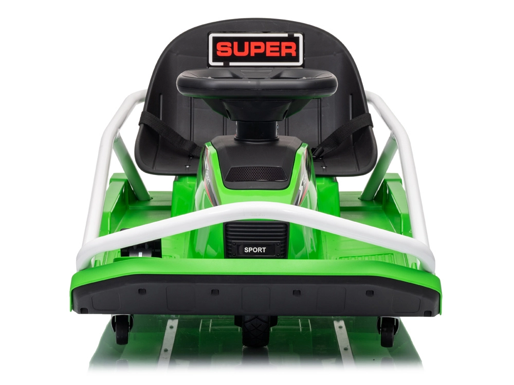 Construcția specială cu 5 roți este proiectată pentru derapaje controlate și drift spectaculos: roți mici față pentru manevrabilitate ușoară, pereche de roți spate pentru stabilitate și roată centrală de tracțiune din cauciuc pentru transfer lin al puterii. Cadru metalic ranforsat pentru durabilitate și stabilitate, în timp ce centura de siguranță, scaunul jos și protecțiile laterale adaugă siguranță și confort.