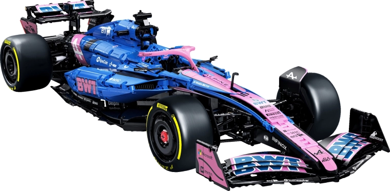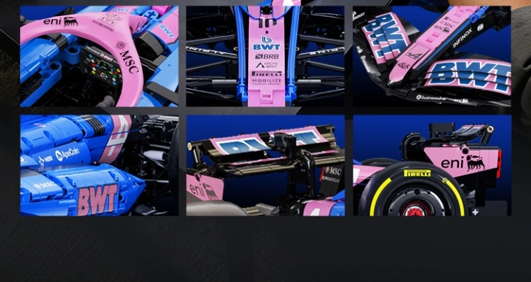 Setul include două variante de autocolante și plăcuțe cu numele piloților #10 Pierre Gasly și #43 Franco Colapinto, astfel încât să personalizați cu ușurință rezultatul. Piese speciale redau fidel halo, oglinzile și volanul, iar modelul este completat de anvelope slick – mai înguste în față și mai late în spate – pentru un aspect de competiție impecabil.