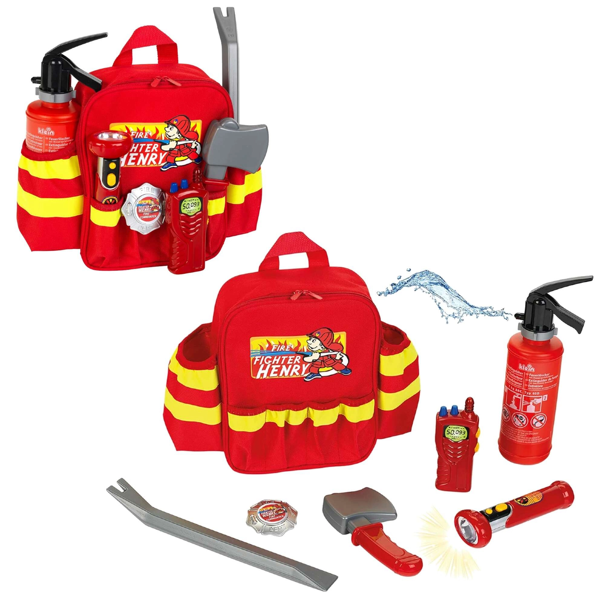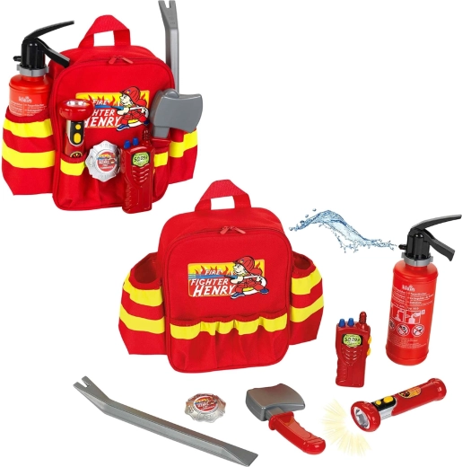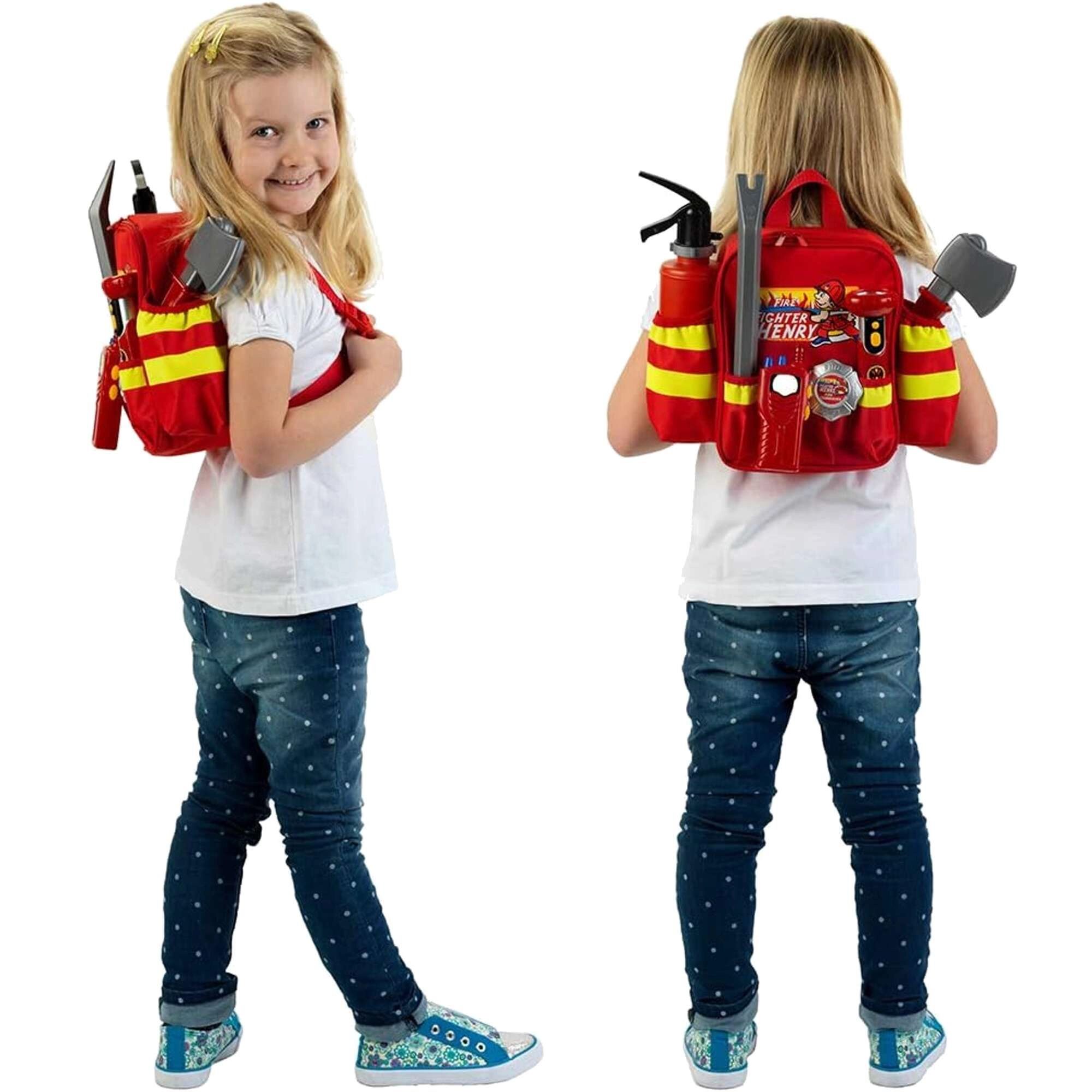 Rucsacul de pompieri HENRY cu accesorii este o alegere excelentă pentru micii eroi care adoră rolurile pline de acțiune. Rucsacul roșu cu benzi reflectorizante transportă în siguranță toate uneltele și este confortabil datorită bretelelor de umăr reglabile. Copiii se vor bucura de dușul de apă din stingător și de lanterna funcțională (cu baterii), ceea ce susține jocul realist de salvare.