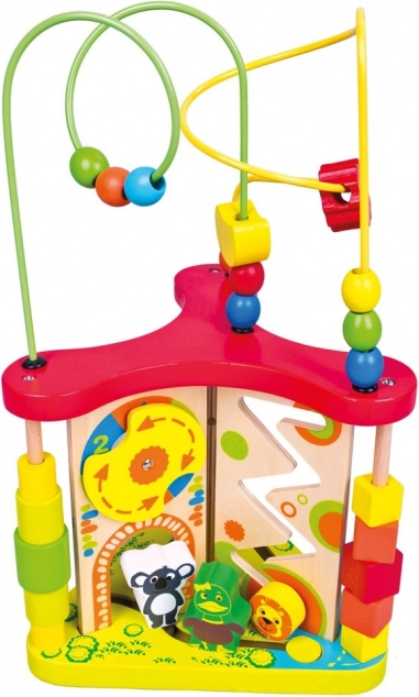 Acest labirint multifuncțional de activități din lemn de la Bino este conceput pentru a-i distra pe copii și, în același timp, pentru a-i dezvolta. Mărgelele pe fire metalice, elementele rotative și glisante și motivele ilustrate cu animăluțe stimulează curiozitatea, concentrarea și coordonarea mână–ochi.