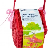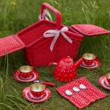 Un coș de picnic fermecător, cu motive de buline și inimioare, ascunde un set de ceai din tablă pregătit pentru orice ceai imaginar. Construcția solidă, cu benzi reglabile cu scai și tiv textil, asigură transportul și depozitarea ușoară a tuturor pieselor. Copiii își dezvoltă interacțiunea socială, motricitatea și creativitatea.