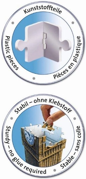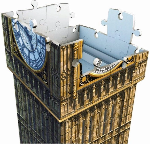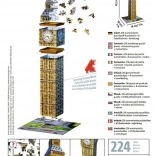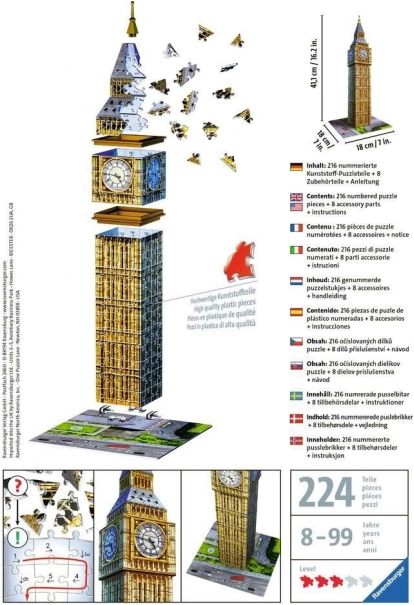 Setul conține în total 216 piese de puzzle numerotate, 8 piese accesorii și un ghid detaliat. După finalizarea puzzle-ului, măsoară aproximativ 18 x 18 x 41 cm. Acest model este ideal atât pentru fanii companiei Ravensburger, cât și pentru cei care iubesc arhitectura și Londra.