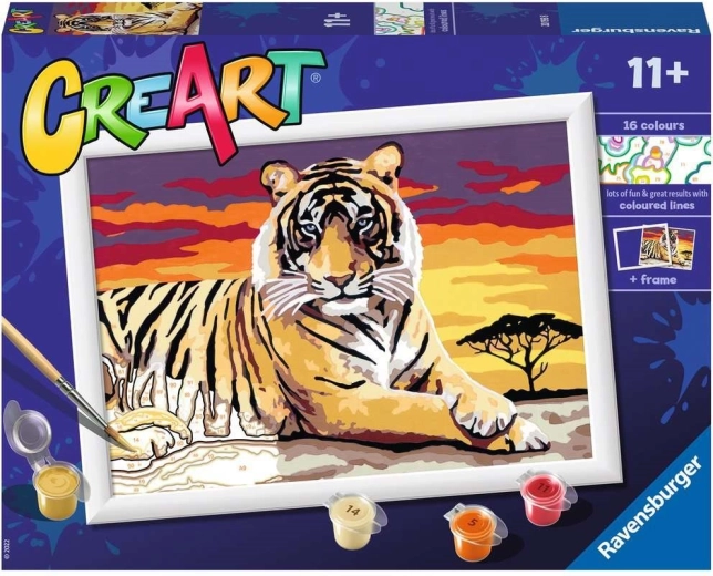 Acest pachet include o pânză cu zone numerotate, culori acrilice, pensulă, stativ și ramă.