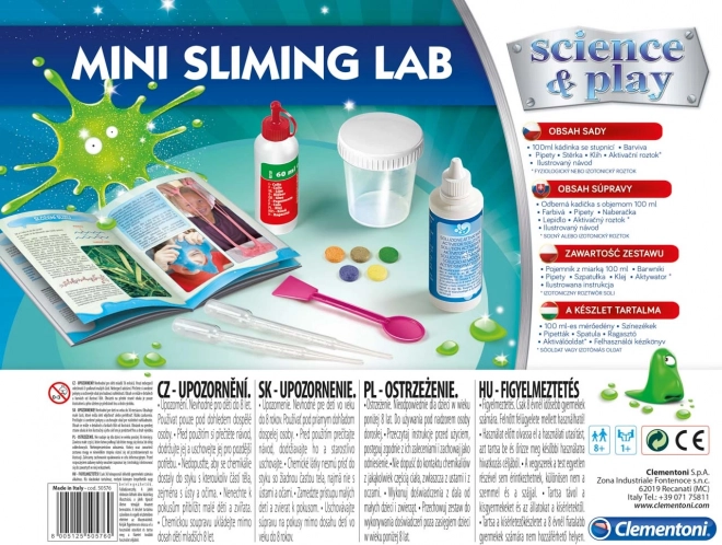 Setul Clementoni Science & Play Micul laborator pentru fabricarea slimei este ideal pentru toți micii entuziaști ai chimiei! Cu ajutorul acestui set, copiii vor descoperi secretele reacțiilor chimice și ale lichidelor vâscoase într-un mod distractiv și sigur.