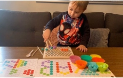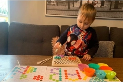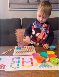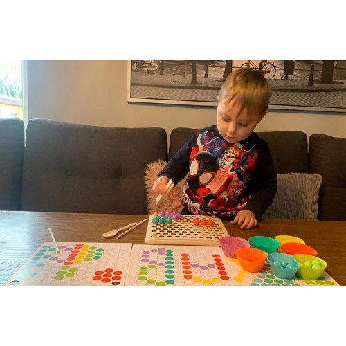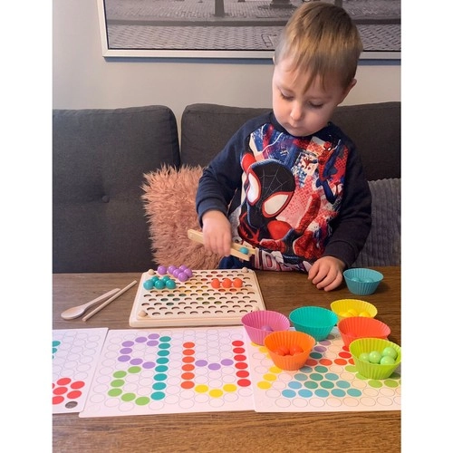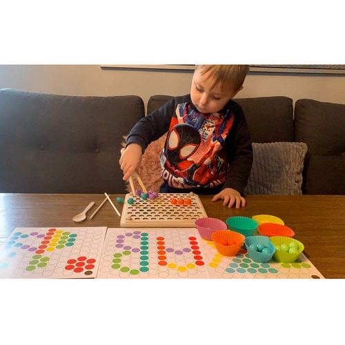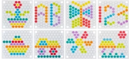 - Pachetul conține: placă pentru inserarea mărgelelor, coșulețe pentru mărgele, mărgele (7 culori), linguriță, pensetă, bețișoare, șabloane cu imagini
