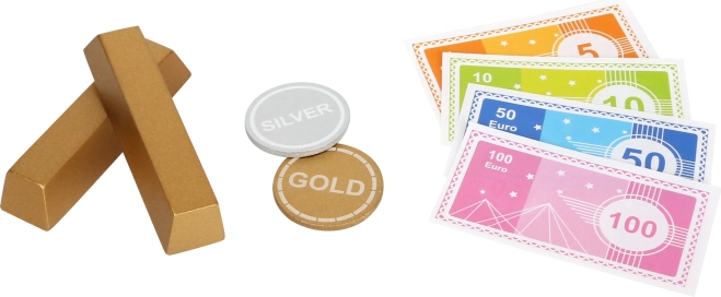 Sunt incluse bancnote euro, monede aurii și argintii, precum și lingouri aurii din lemn. Excelent pentru învățarea valorii banilor, calcule și jocuri de rol cu bancheri și clienți.