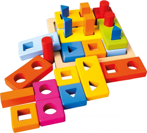 Un puzzle simplu, plin de culori cu multe piese de forme diferite, care luminează orice raft. Dezvoltă logica și motricitatea fină a copilului și oferă o construcție durabilă și robustă din lemn masiv.