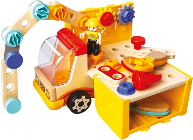 Descoperă distracția pe șantier cu camionul de construcții multifuncțional BINO, care combină lemnul și plasticul pentru durabilitate și greutate redusă. Include figurină șofer, benă rabatabilă și accesorii bogate – cheie, ciocănel, șurubelniță și piese de construcție pentru construcții creative. Jocul dezvoltă motricitatea fină, imaginația și susține jocul de rol al micilor constructori.