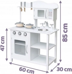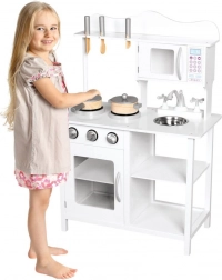 Bucătărie compactă și robustă pentru micii bucătari. Include chiuvetă, aragaz și cuptor cu microunde, cu accesorii. Potrivită pentru copiii de la 3 ani.
