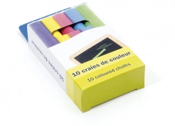 Set practic de cretă școlară în ambalaj din carton, ideal ca accesoriu pentru tablele pentru copii și de birou. Conține 10 bucăți de cretă colorată pentru scriere și desenare confortabilă pe tablă.
