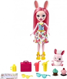 Păpușa Bree cu păr lung roz și urechiușele ei de iepure este pregătită de călătorie. Ținuta ei include o rochie de vară cu imprimeu floral, pantofi și ochelari de soare.