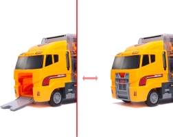 Acest transportor și set de joacă 2 în 1 îmbină distracția cu practicitatea. Remorcherul cu pereți transparenți găzduiește șase vehicule de construcții detaliate și servește totodată ca organizator compact. Copiii se bucură de joacă realistă de șantier datorită părților mobile și rampei de ieșire acționate prin buton.