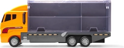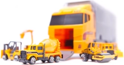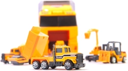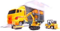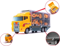 Set mare pentru micii constructori: camion remorcher robust cu capac transparent, care servește drept organizator și transportor pentru 6 mini utilaje de construcții (excavator, încărcător, betonieră etc.). Datorită capotei rabatabile și rampei retractabile, mașinuțele ies ușor la apăsarea unui buton. Jucăria este din plastic ABS rezistent, are detalii realiste și este ușor de transportat – ideală acasă, în călătorii și la grădiniță.