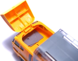 Remorcherul are capac transparent și compartimente pentru toate cele 6 mașinuțe. Copiii au utilajele mereu la îndemână, iar setul se strânge și se transportă ușor.