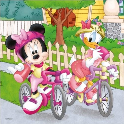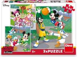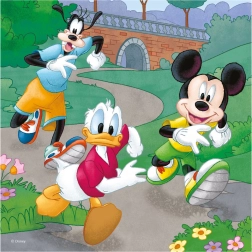 Trei puzzle-uri colorate cu eroii MICKEY ȘI MINNIE îi entuziasmează pe copii pentru sport și pentru asamblare. Fiecare dintre cele 3 imagini a câte 55 de piese aduce scene amuzante de alergare, baschet și ciclism. Carton de calitate, execuție sigură și producție în Cehia care sprijină motricitatea fină, imaginația și concentrarea copiilor de la 5 ani.