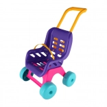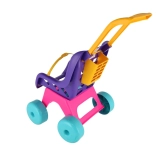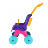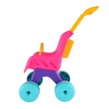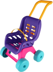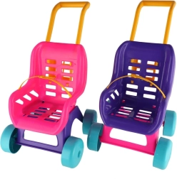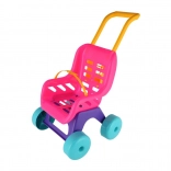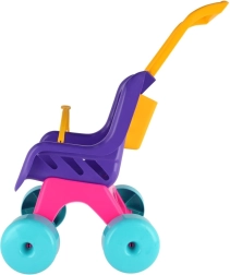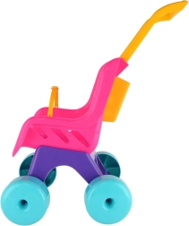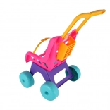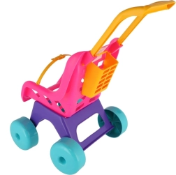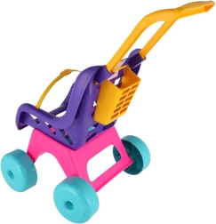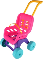 Cărucior ușor din plastic pentru păpuși, cu mâner înalt și roți stabile, ideal pentru joacă atât în casă, cât și afară. Oferă centură de siguranță pentru păpușă, coș practic sub mâner și manipulare facilă datorită greutății reduse și construcției rezistente.