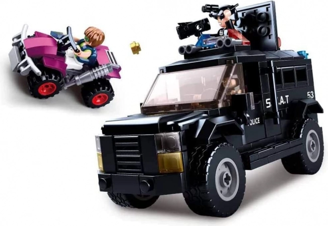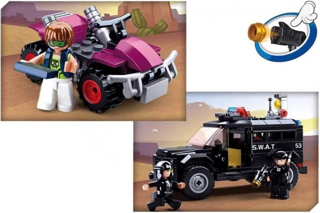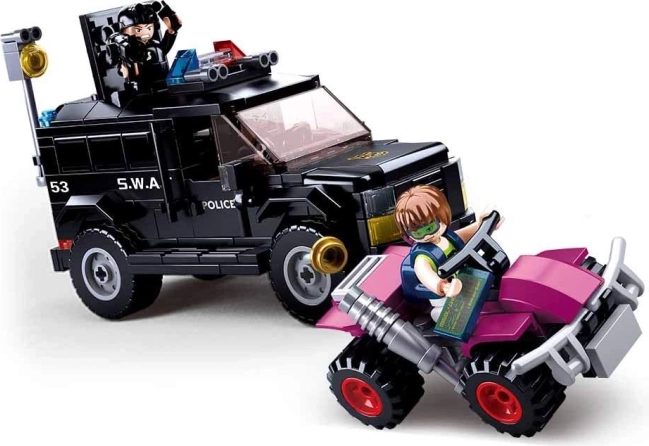 Acest set de construcție de acțiune SLUBAN POLICE aduce tot ce aveți nevoie pentru scenarii de poliție dramatice: vehicul SWAT robust, ATV-ul fugarului și trei figurine detaliate cu accesorii. Datorită plasticului ABS de calitate, modelul este rezistent și pregătit pentru ore îndelungate de joacă.