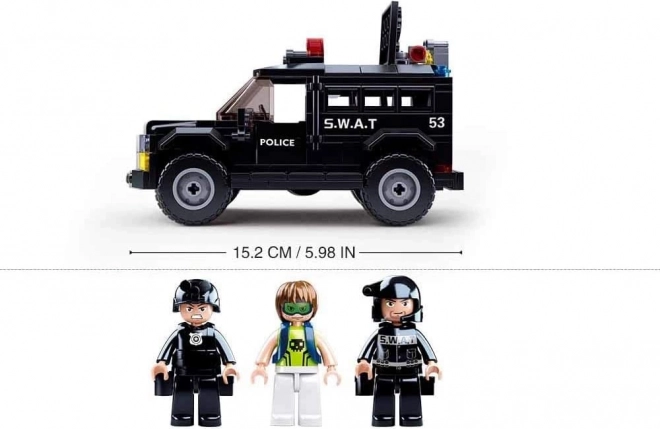 Vehicul de poliție negru cu acoperiș pentru figurină, inscripții S.W.A.T. și elemente realiste, precum lumini, oglinzi și roți robuste.