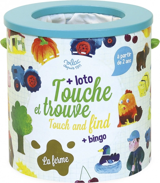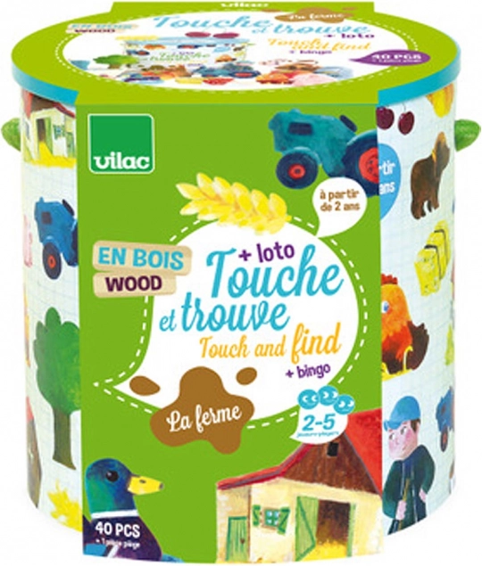 Jocul Vilac Pipăie și găsește - Fermă este ideal pentru dezvoltarea motricității fine și a simțului tactil la copii. Jucătorii trebuie să ghicească prin pipăit ce obiecte se află în interiorul găleții. Pentru copiii mai mari, jocul oferă o variantă de loto sau bingo cu ajutorul cartonașelor cu imagini ale obiectelor furnizate.