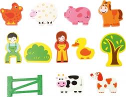 Descoperă farmecul fermei într-un ambalaj practic. Valiza de călătorie se transformă, odată desfăcută, într-o planșă de joacă ușor de urmărit, pe care prind viață poveștile cu 12 figurine din lemn reprezentând animale de fermă. Datorită lemnului masiv, figurinele sunt rezistente, plăcute la atingere și atrag prin culorile lor vii.