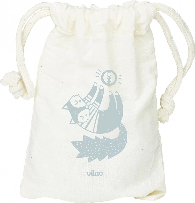 Include un săculeț textil cu imprimeu VILAC pentru depozitarea în siguranță a jucăriei acasă și în deplasare.