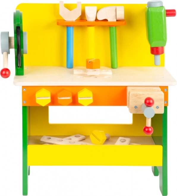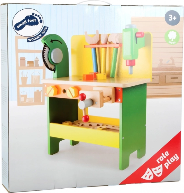 Bancul de lucru din lemn pentru copii Small Foot Christian este un mini-atelier complet echipat, care va încânta orice mic meșteșugar. Include bormașină detașabilă, fierăstrău, menghină, ciocan, șurubelniță, chei, șuruburi și plăcuțe perforate. Datorită organizării bine gândite, totul este la îndemână, iar copiii își exersează motricitatea fină și răbdarea.