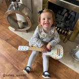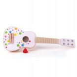 Chitara este fabricată din lemn robust și rezistent și respectă standardele europene actuale de siguranță. Imprimeul cu steluțe atrage privirea din prima și îi motivează pe copii să ofere mici reprezentații pentru familie și prieteni. Cântatul la chitară dezvoltă ritmul, percepția senzorială, îndemânarea și creativitatea.