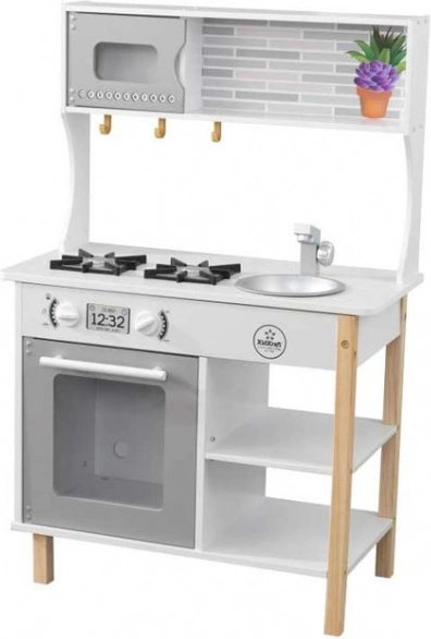 Bucătăria din lemn KidKraft cu un design stilat transformă camera copilului într-un mic bistro. Oferă butoane rotative realiste cu clic, uși care se deschid la cuptor și la cuptorul cu microunde și 38 de piese. Datorită chiuvetei detașabile pentru curățare ușoară, rafturilor și cârligelor, totul are locul său. Potrivită de la 3 ani. Dimensiuni 59,9 × 34,29 × 90 cm.