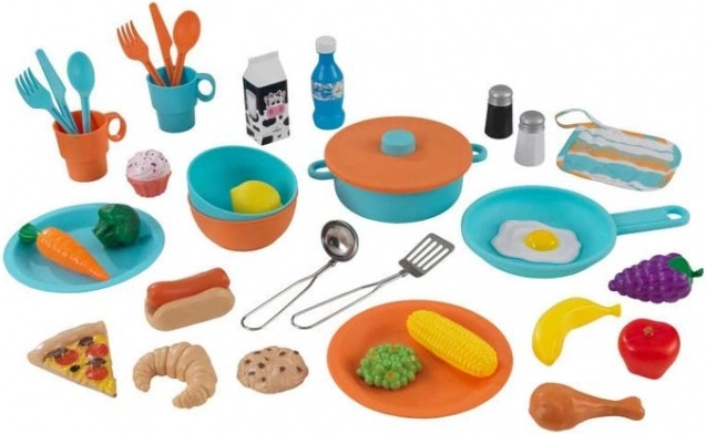 Pachetul include 38 de piese de veselă, alimente și ustensile de bucătărie. Copiii pot servi, amesteca, tăia și descoperi rețete noi imediat.