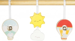 Această arcadă stabilă și sigură pentru copii este creată din lemn de înaltă calitate, cu atenție la siguranța copiilor. Jucăriile colorate sub formă de nor, munți și baloane cu aer cald sunt suspendate pe șnururi textile și sună ușor.