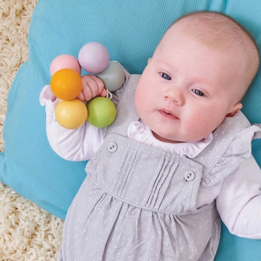 Mărgelele din lemn în nuanțe pastel, pe elastic, se țin plăcut în mână și ajută la calmarea gingiilor sensibile pe durata erupției dentare.
