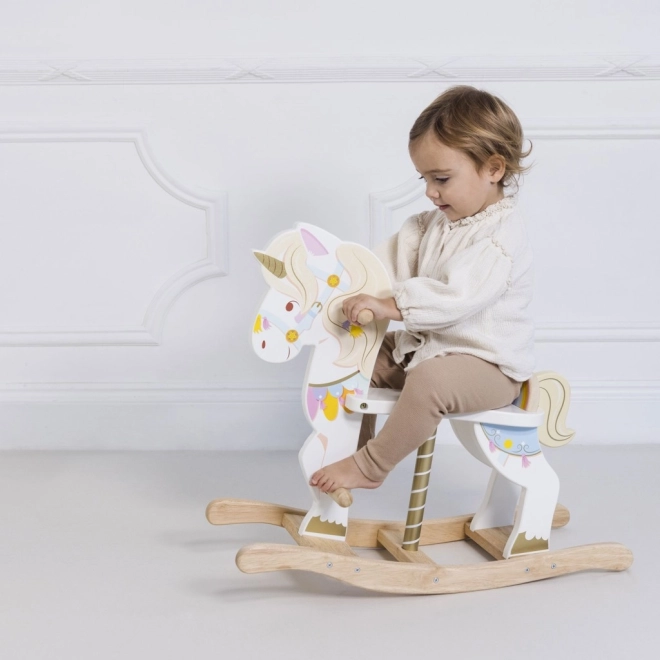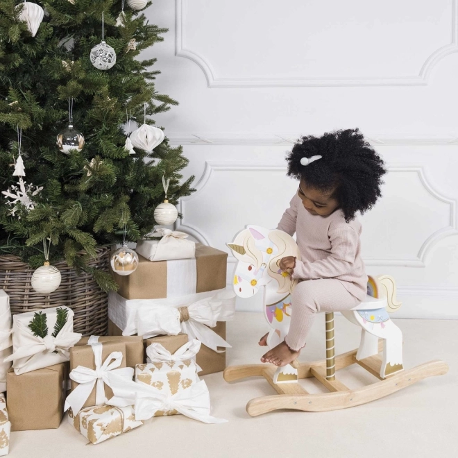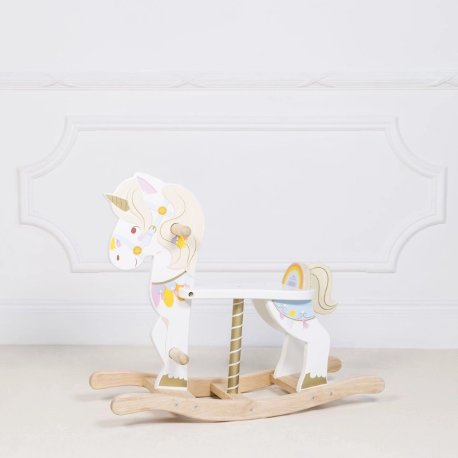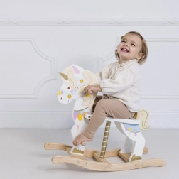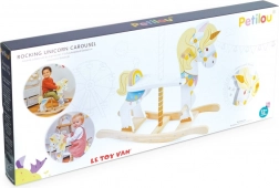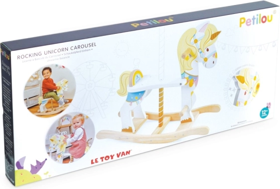 Unicornul balansoar LE TOY VAN din colecția Petilou este o jucărie clasică în interpretare modernă. Datorită bazei solide din lemn și ergonomiei bine gândite, susține legănarea naturală, dezvoltă coordonarea, echilibrul și încrederea în mișcare. Detaliile colorate bogate, cornul auriu și expresia prietenoasă stimulează imaginația și bucuria jocului.