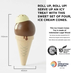 Răsfățați micii vânzători de înghețată! Acest set fermecător include patru cornete pictate manual pe un suport robust. Datorită lemnului de calitate și vopselelor netoxice, jocul este sigur și de durată. Susține imaginația, motricitatea fină și coordonarea mână–ochi și este ideal pentru jocuri de rol.