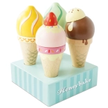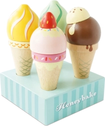 Setul de înghețate din lemn HONEYBAKE de la Le Toy Van transformă orice cameră de copil într-o mică gelaterie. Patru cupe decorate diferit pe cornete naturale sunt pictate manual cu vopsele ecologice pe bază de apă și așezate pe un suport stilat pentru expunere ordonată.