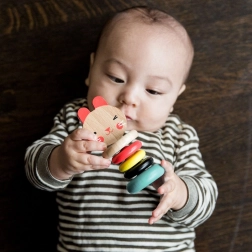 Zornăitoare adorabilă din lemn în formă de iepuraș de la Petit Collage, care încântă bebelușii cu un sunet blând și liniștitor. Are cinci inele netede din fag ideale pentru mânuțele mici, culori și modele vii pentru dezvoltarea simțurilor și este realizată din lemn 100% certificat FSC cu vopsele pe bază de apă netoxice.