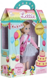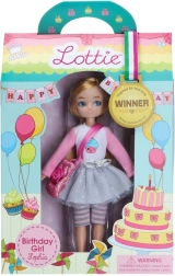 Lottie Birthday Girl Sophia aduce bucuria zilei de naștere în fiecare zi. Poartă un tricou roz cu imprimeu cupcake, fustă argintie și colanți/pantaloni scurți în dungi, completate de adidași argintii și o poșetă roz sclipitoare. Păpușa are genunchi articulați, stă singură și părul ei premium din nailon este moale și nu se încâlcește.