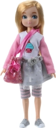- Păpușă, tricou cu imprimeu, fustă argintie, pantaloni scurți/colanți în dungi gri–roz, adidași argintii, poșetă roz sclipitoare, 3 cărți poștale